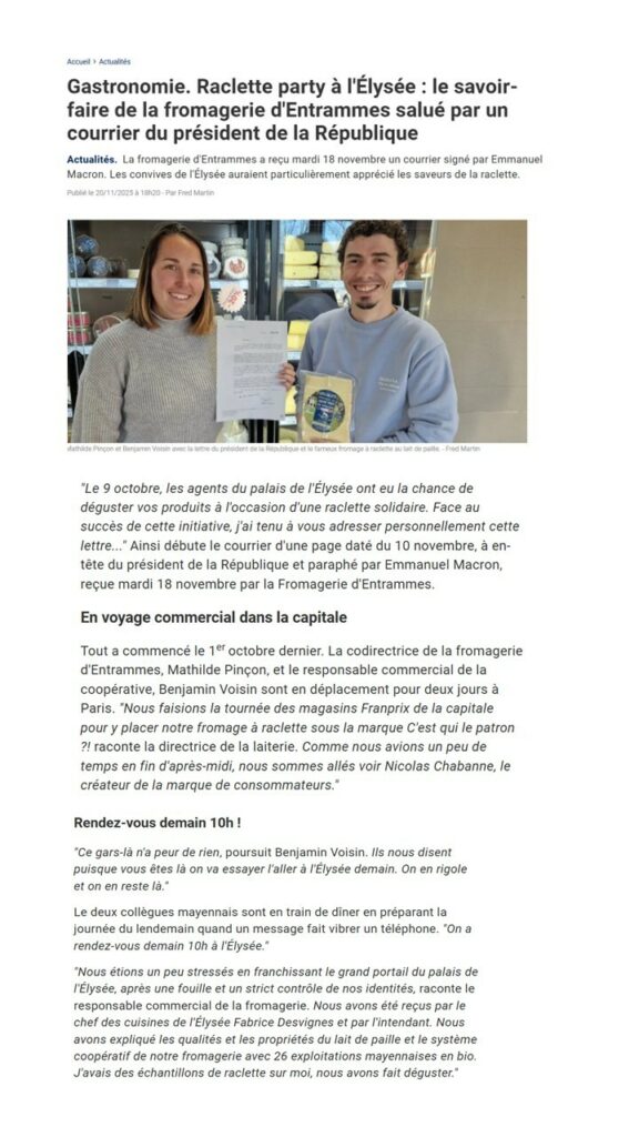 Gastronomie. Raclette party à l’Elysée : le savoir-faire de la fromagerie D’Entrammes salué par un courrier du président de la République