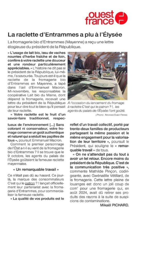 Gastronomie. Raclette party à l’Elysée : le savoir-faire de la fromagerie D’Entrammes salué par un courrier du président de la République