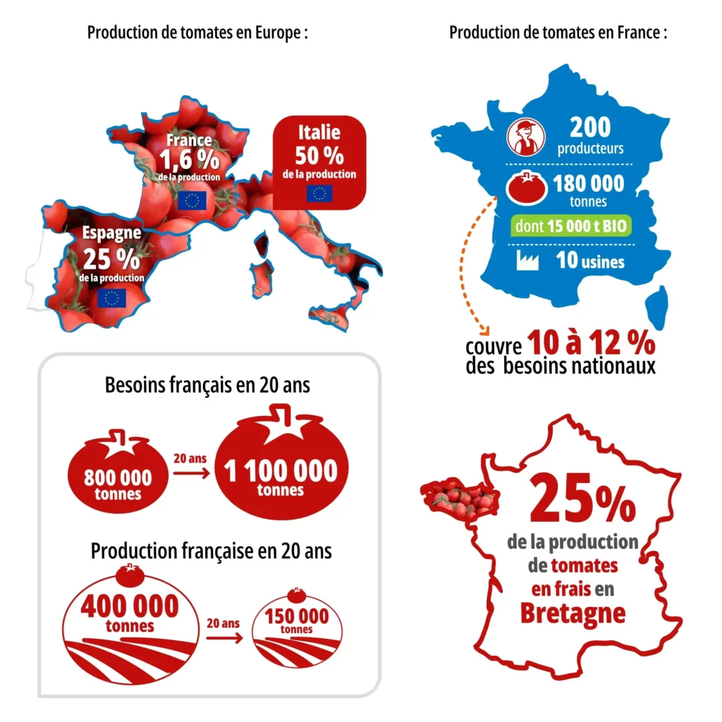 Alors que les besoins français sont passés de 800 000 tonnes à 1,1 million de tonnes en vingt ans, la production française de tomates destinées à la transformation a chuté sur la même période de 400 000 tonnes à 150 000 tonnes*. La consommation française de tomates transformées devrait rester dynamique et offrir de belles opportunités à la tomate transformée française. La Bretagne qui produit 25 % de la production de tomates en frais n’est, pour l’heure, pas du tout positionnée sur la tomate pour l’industrie, avec à peine 1 % de la production française.